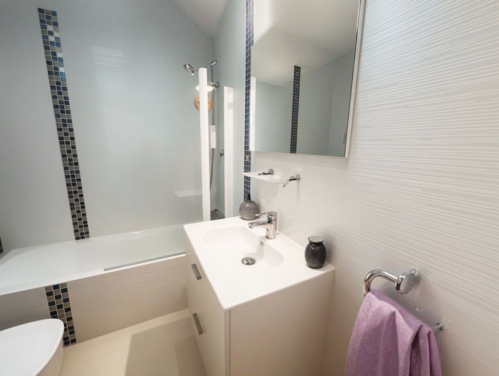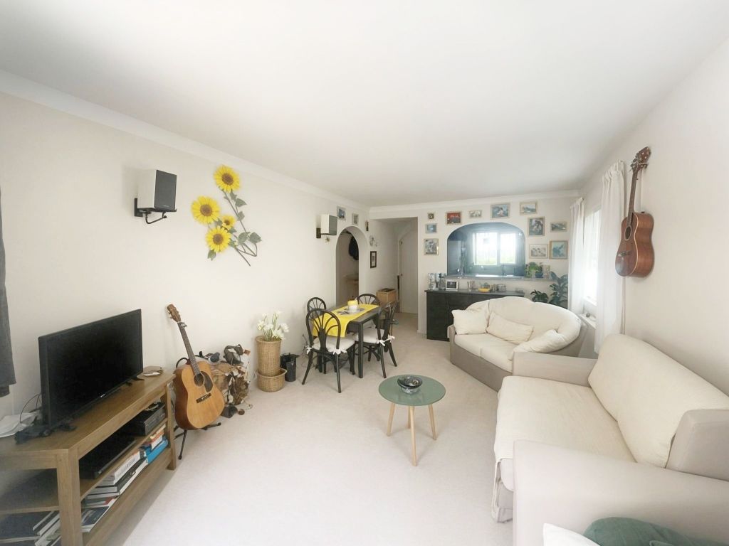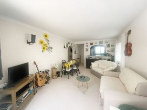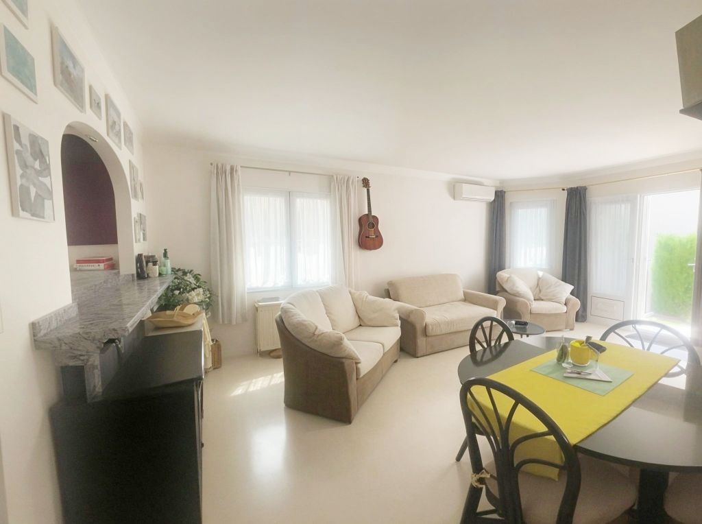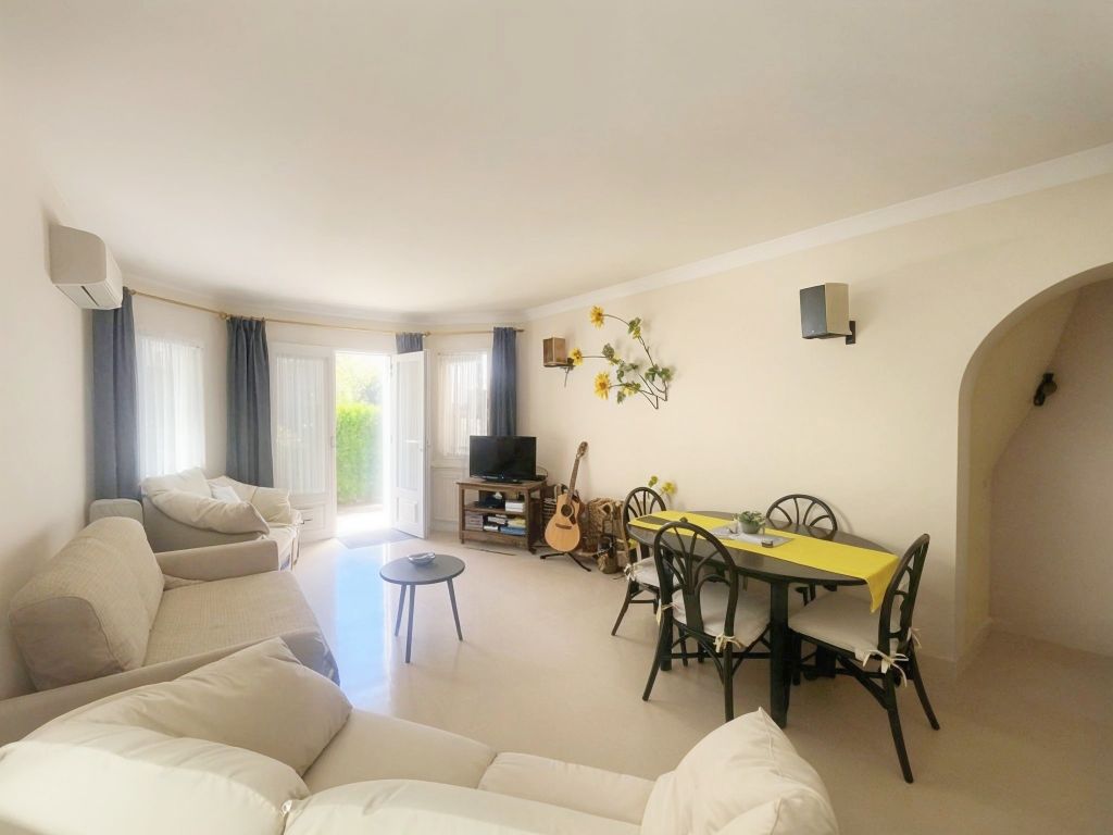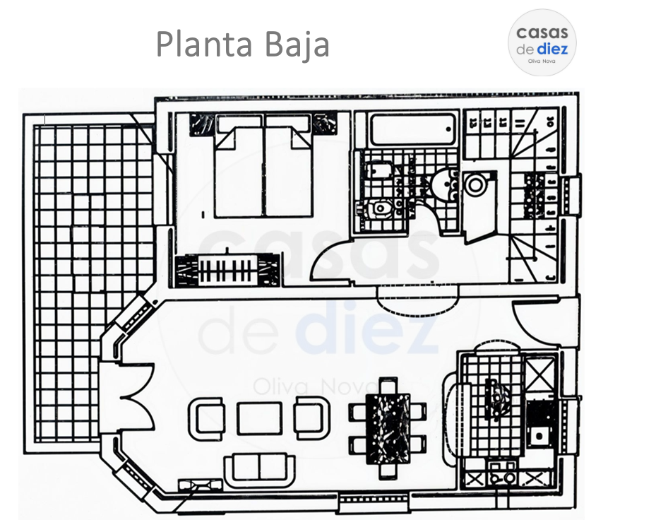 Planta baja con una superficie construida de 63 m2 correspondientes a salón con zona de comedor, cocina equipada (encimeras, armarios, vitrocerámica, lavavajillas, frigorífico, etc.), un dormitorio de matrimonio y cuarto de baño completo con bañera y lavadora, pasillo y escalera de acceso a la planta alta. Terraza descubierta de 13 m2 con porche.