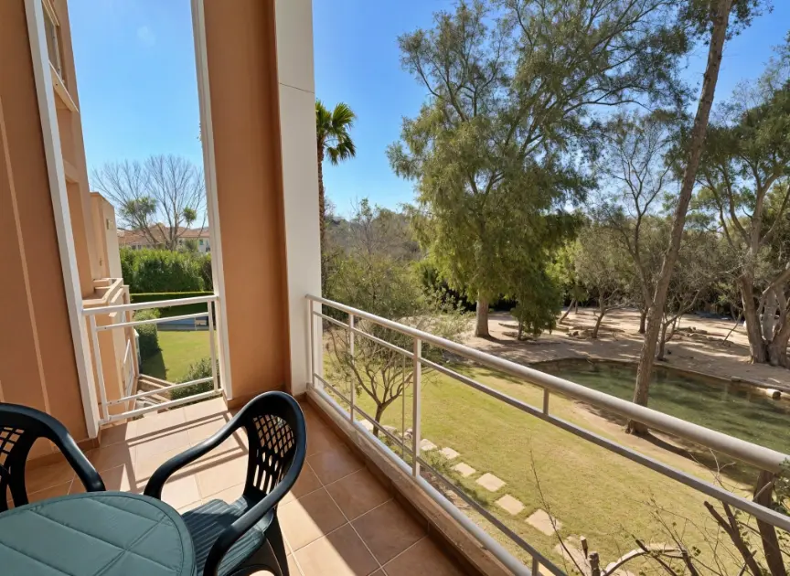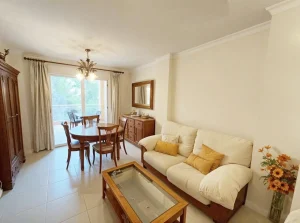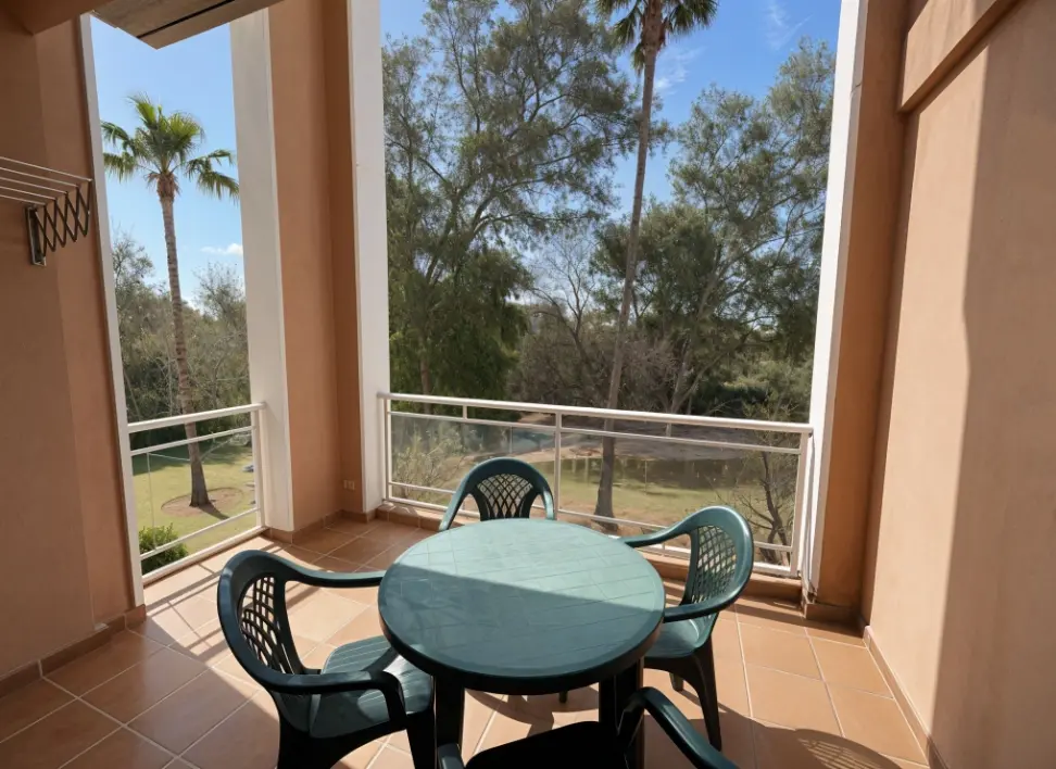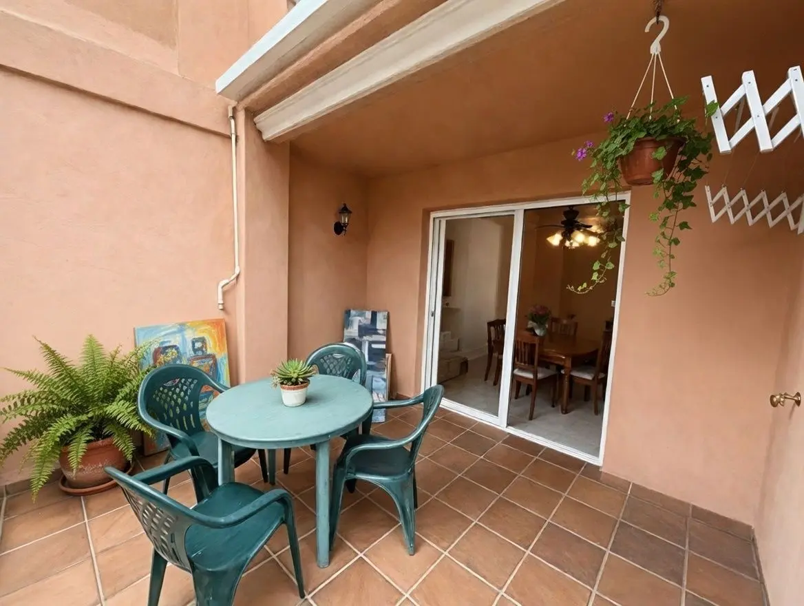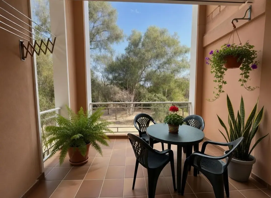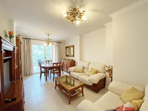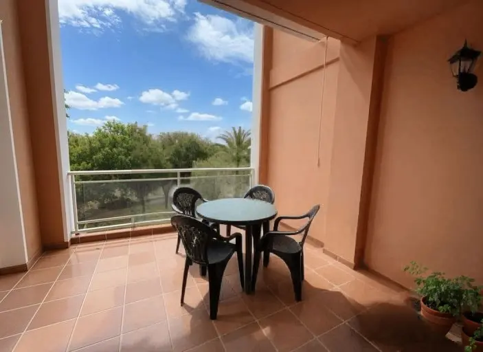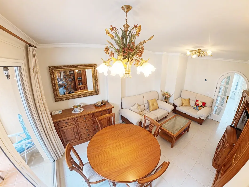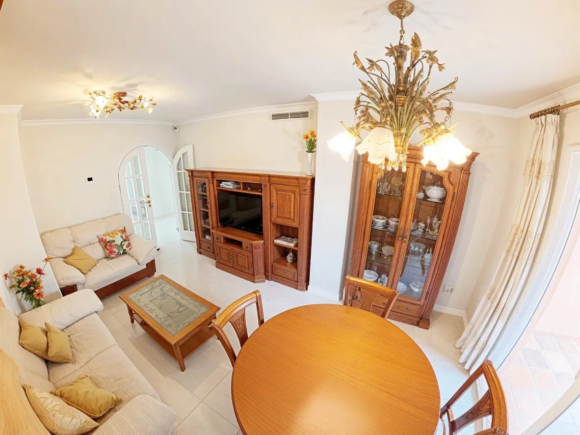 Acogedor salón con TV, zona de comedor, cocina independiente con despensa y electrodomésticos (frigorífico, horno, lavadora, microondas, vitrocerámica y armarios, etc.) Amplia terraza semi cubierta con toldo y vistas a Oliva Nova y a los jardines.
