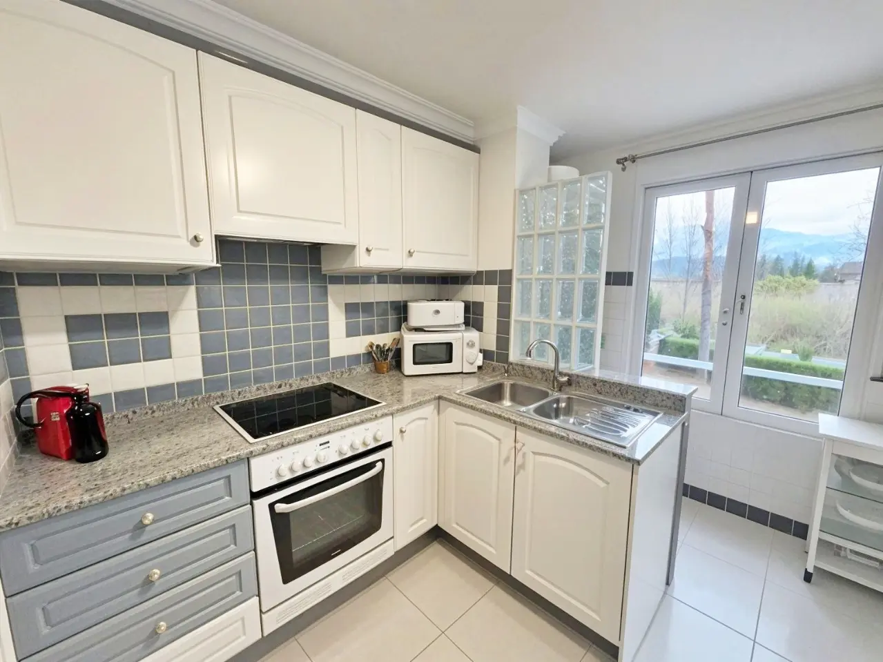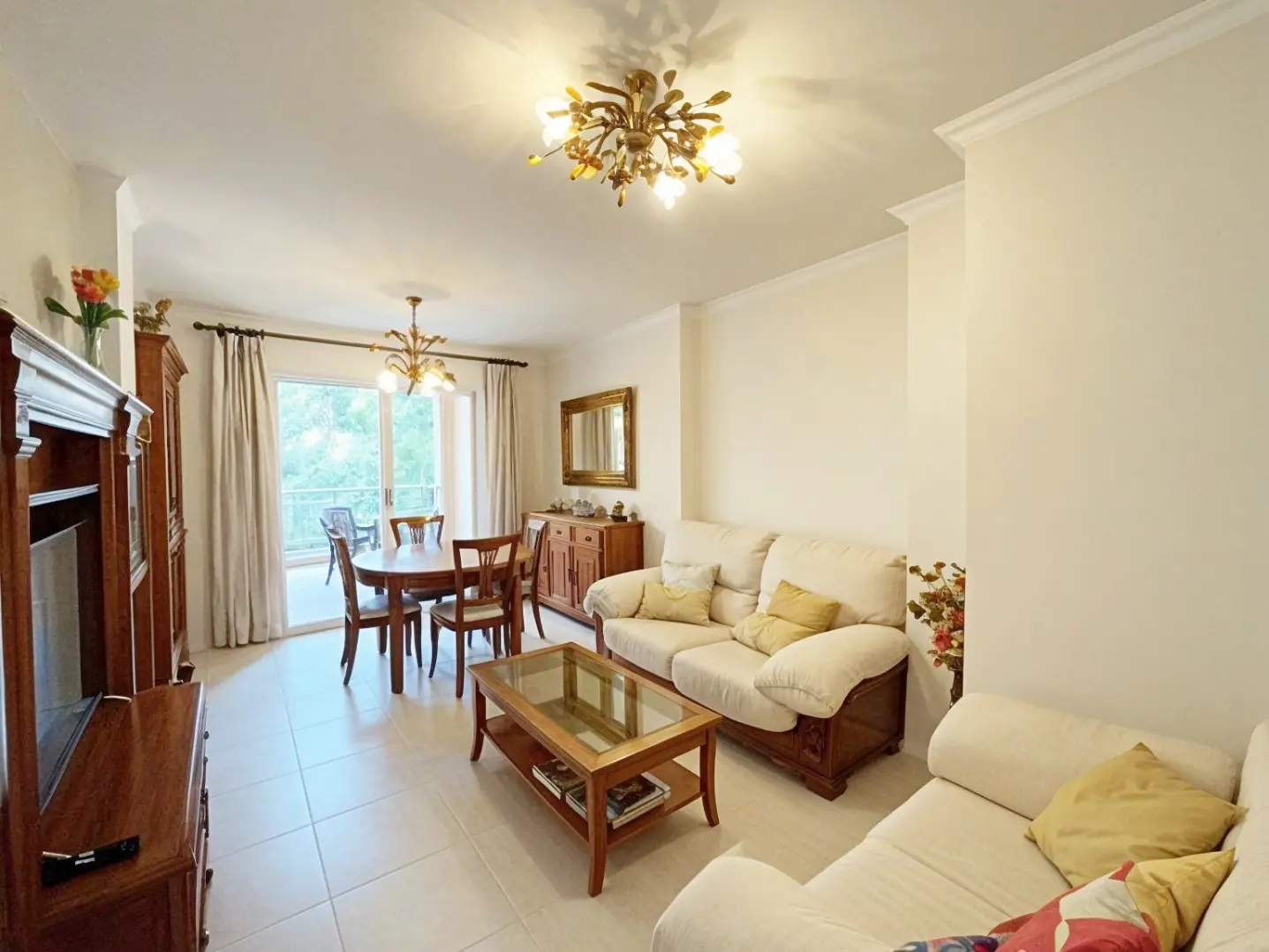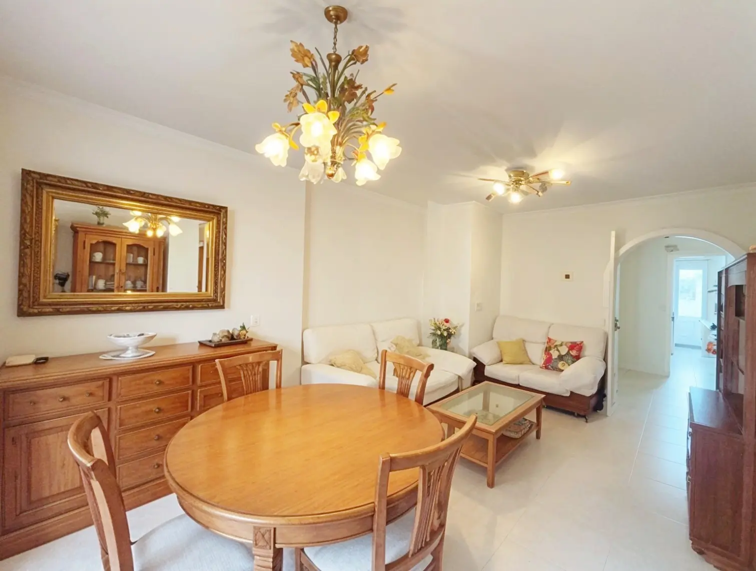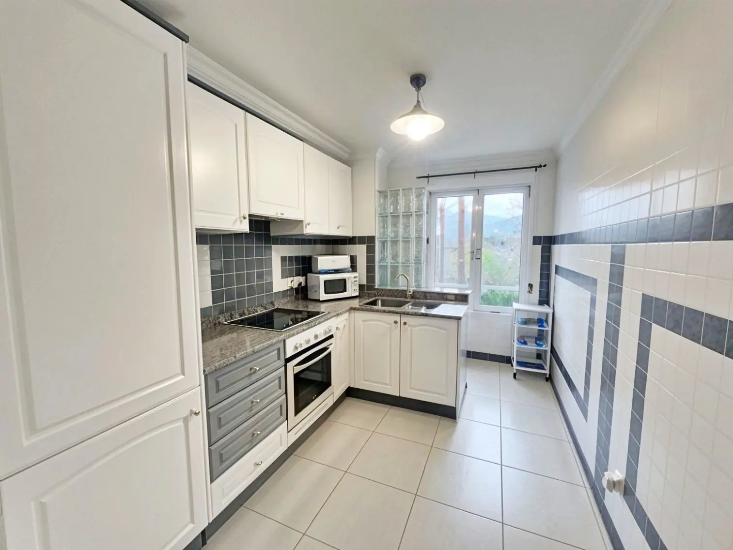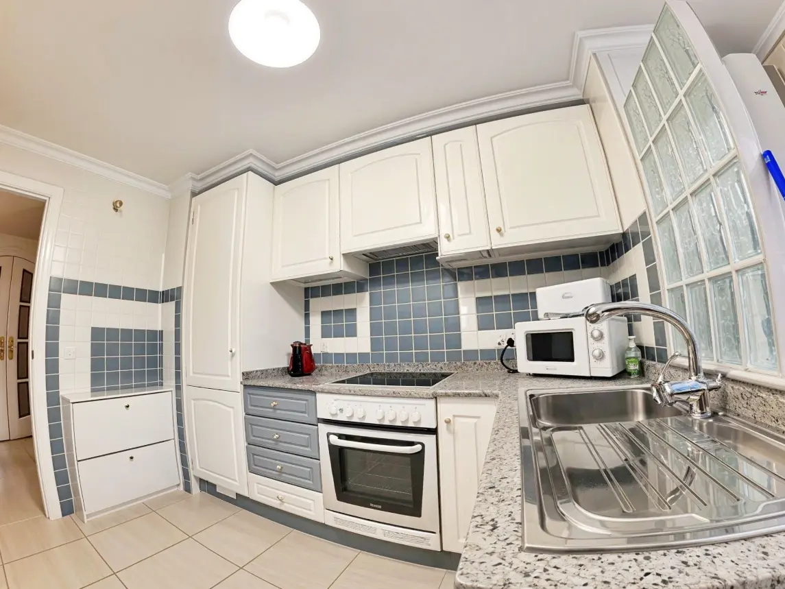 Acogedor salón con TV, zona de comedor, cocina independiente con despensa y electrodomésticos (frigorífico, horno, lavadora, microondas, vitrocerámica y armarios, etc.) Amplia terraza semi cubierta con toldo y vistas a Oliva Nova y a los jardines.