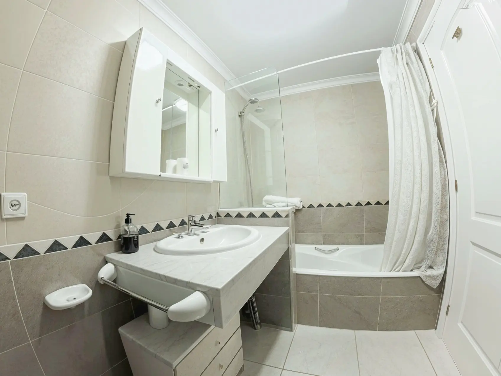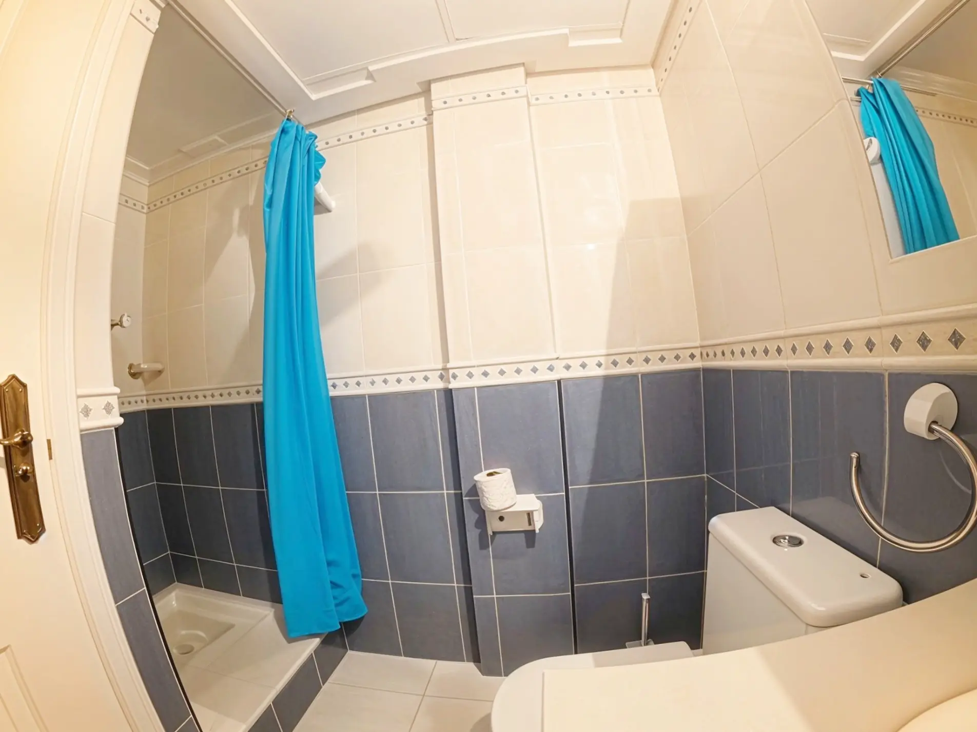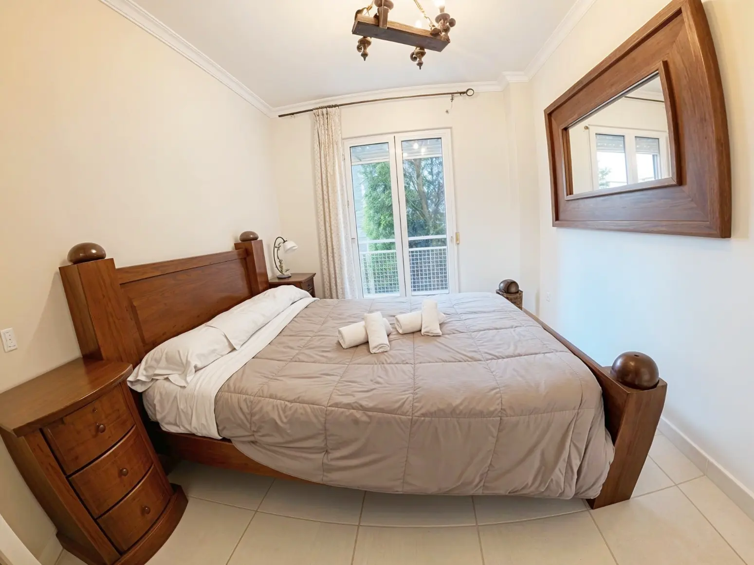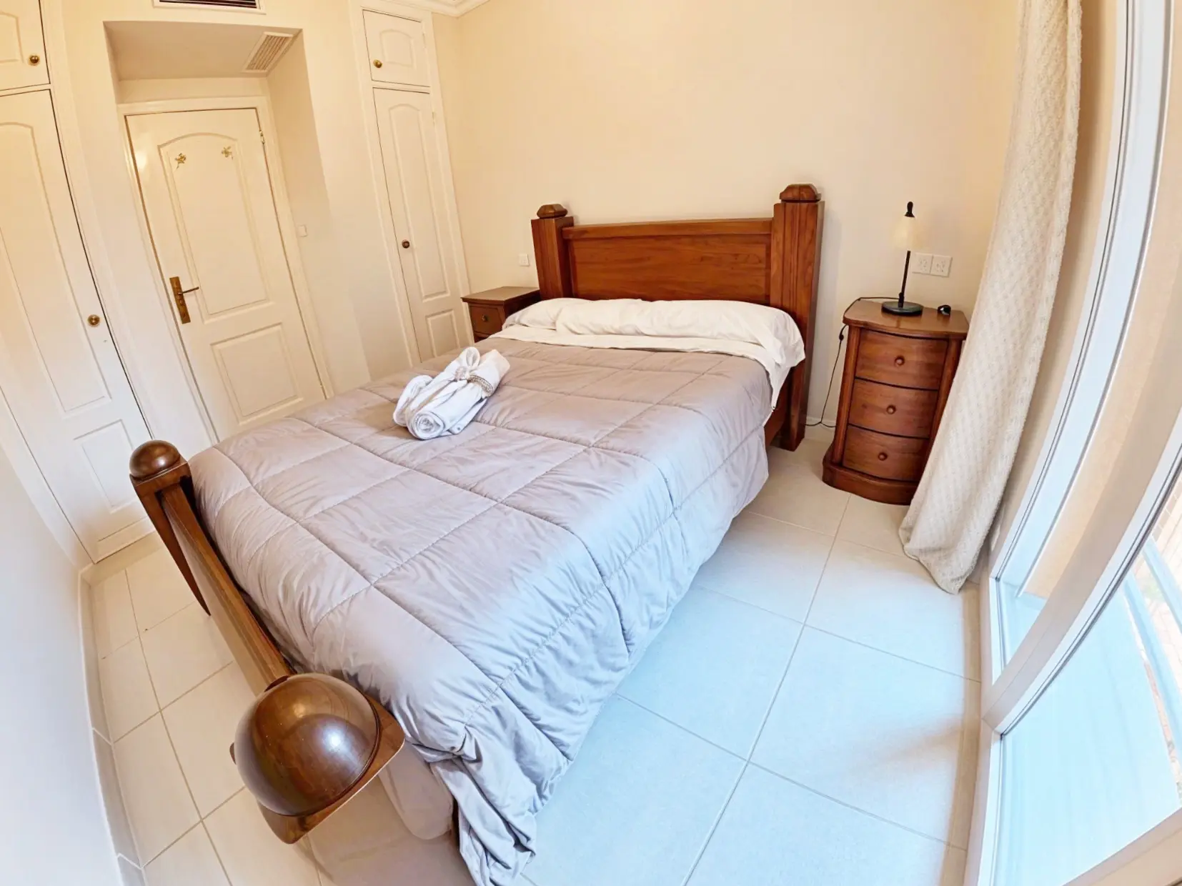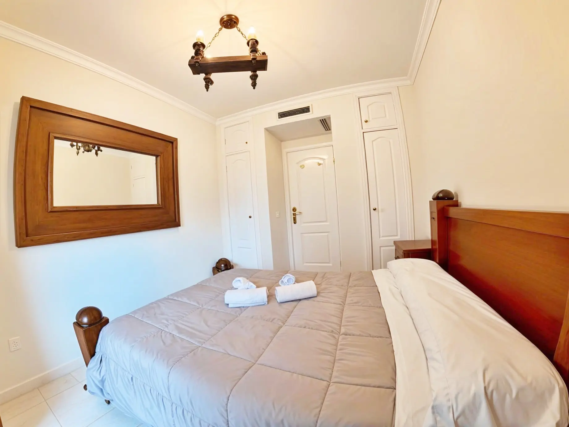 Dormitorio principal con cama de matrimonio, baño completo con bañera, segundo dormitorio con baño en suite con ducha.