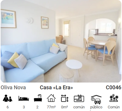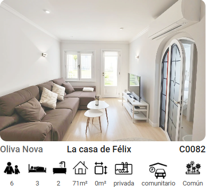 La casa se encuentra en la exclusiva urbanización de Oliva Nova, rodeada de un paisaje impresionante entre playa, montañas, naranjos y el azul del mar. Situada a 6 km. de la ciudad de Oliva, a 15 km. de Gandía y a 20 km. de Denia. Está perfectamente comunicada por la autopista AP7, el AVE en Valencia a unos 45 minutos y los aeropuertos de Alicante y Valencia.