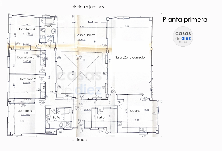 Planta primera: Incluye gran porche cubierto, recibidor, amplio salón con chimenea, muy luminoso., cocina totalmente equipada (frigorífico, lavavajillas, encimeras, armarios, vitrocerámica, horno, etc.) con zona de comedor y despensa, muy luminosa., dormitorio con baño completo en suite con bañera, tres dormitorios y dos baños (uno de ellos con bañera y ducha, otro con lavadora)., amplio patio central con toldo., terraza trasera con salida directa a una gran piscina y jardines rodeando toda la casa.