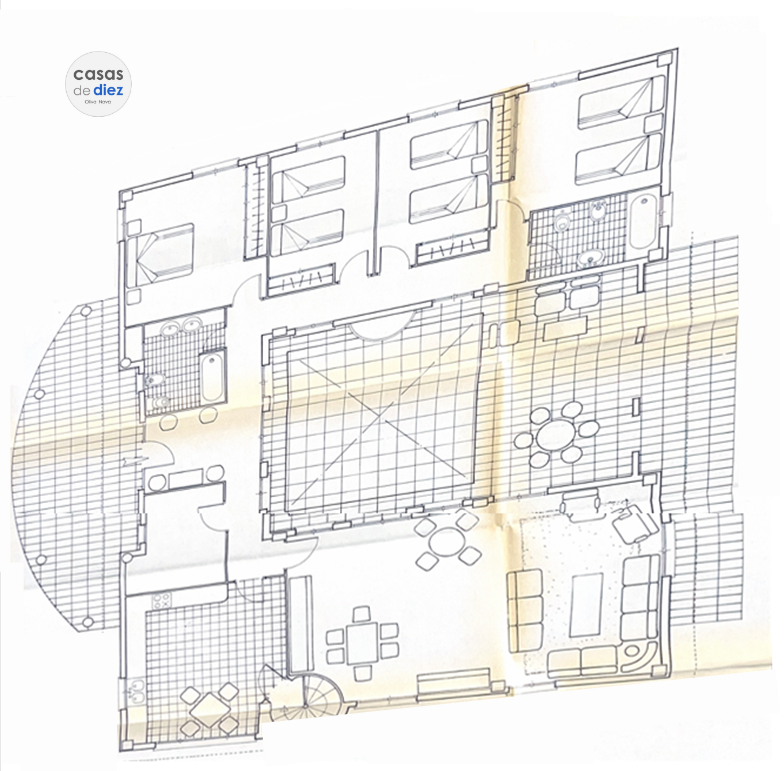 Planta Segunda: Espacio diáfano con entrada a una terraza con vistas panorámicas al patio interior, jardines, piscina y montaña.
