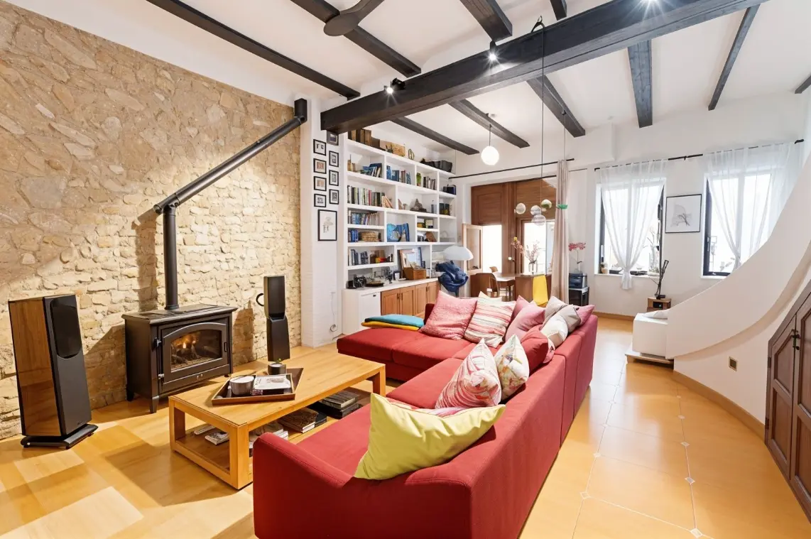 - Planta principal: El espacio social se abre con un acogedor salón presidido por una eficiente chimenea de pellets, creando el ambiente perfecto para el invierno. Fluye hacia una amplia zona de comedor y una cocina de alta gama totalmente equipada, completada con un aseo de cortesía.