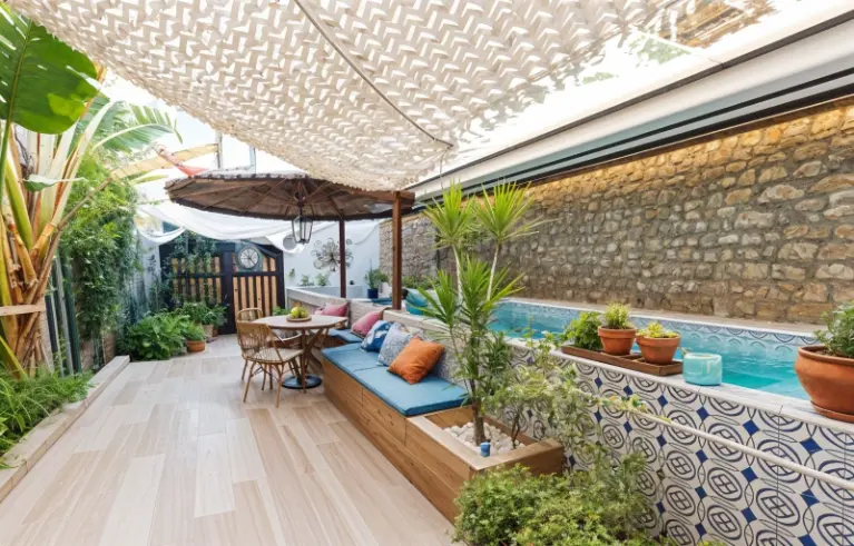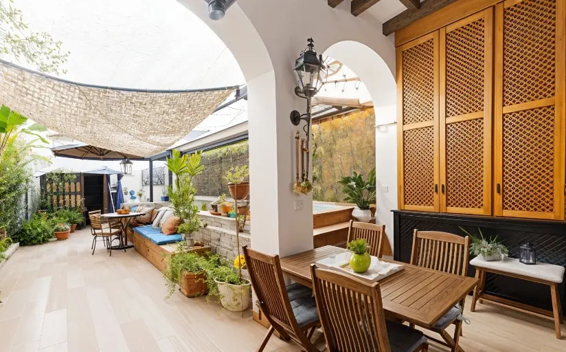 El verdadero corazón de esta casa se revela en el patio interior, un espacio privado y bellamente vallado, transformado en un auténtico centro de bienestar y ocio: