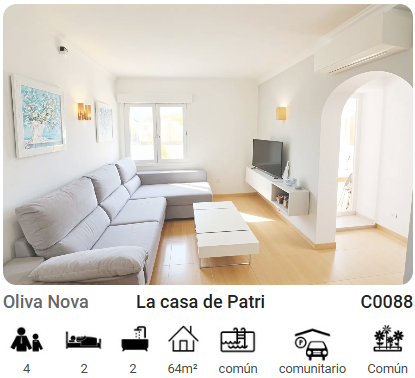 La casa de Mireya es un apartamento adosado ubicado a solo 300 metros de la playa y junto 150 metros del MET (Mediterranean Equestrian Tour), en Oliva Nova , Camino de Boriol, dentro del Residencial Club Sevilla V, construido en el año 2006. Capacidad para 4 personas.