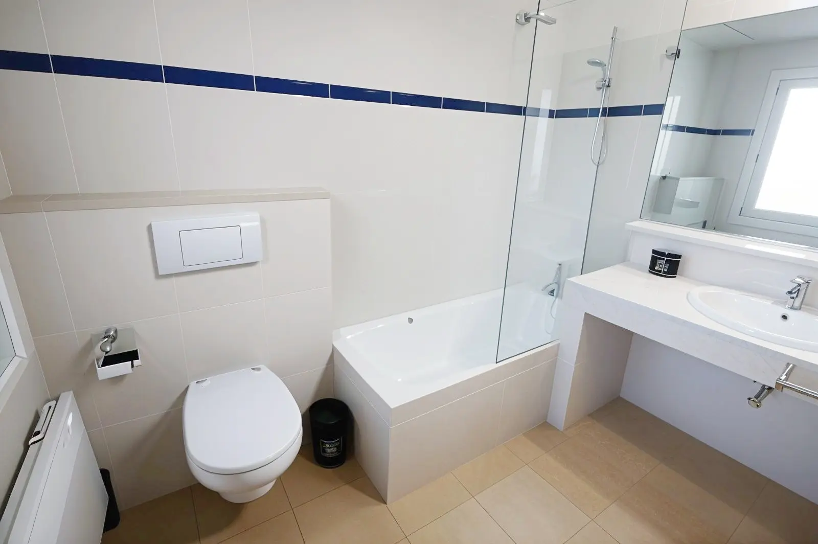 - Dormitorio de matrimonio con baño completo en suite con bañera.