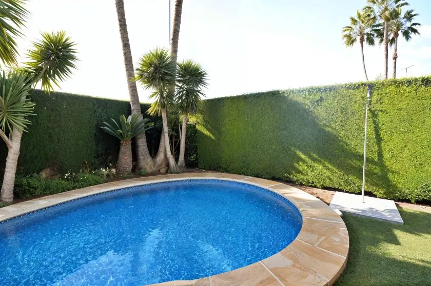 Jardines y parcela vallada en todo su perímetro con piscina privada.
