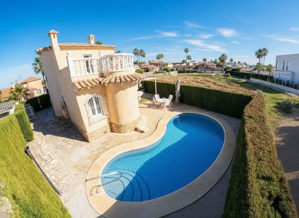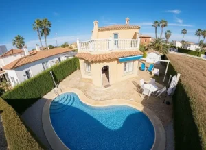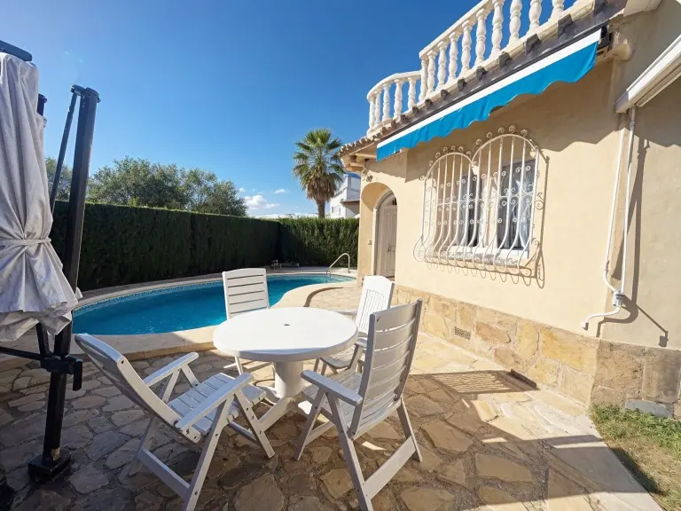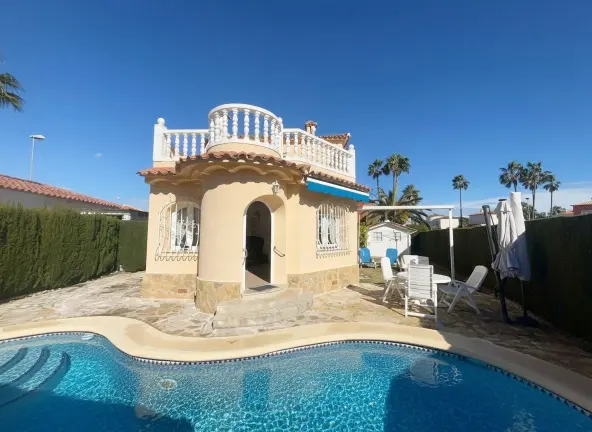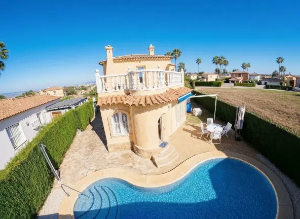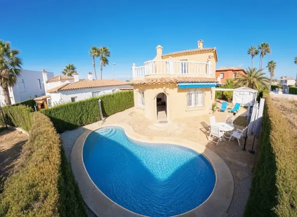 Espectacular Villa independiente con piscina y jardín. Avda. Brueghell de Oliva Nova. Superficie construida de 133 m2 en una parcela de 311 m2. Año de construcción 2002. Dos plantas, buen estado de conservación. A tan solo 700 metros de la playa.